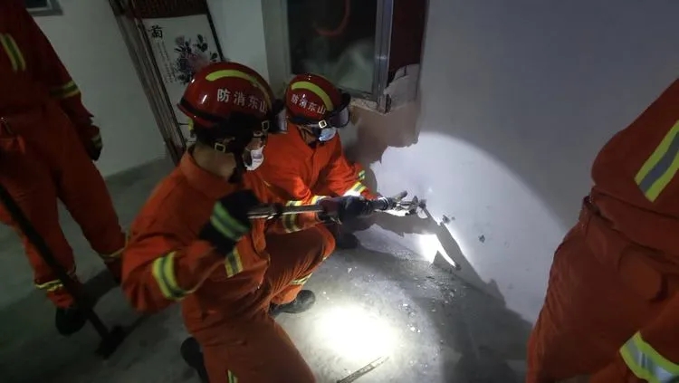 3、消防救援人員經(jīng)過30多分鐘的緊急破拆出營救出口,次日凌晨1時許將7名被困人員依次救出,并移交120。