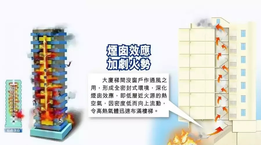 當(dāng)建筑物內(nèi)發(fā)生火災(zāi)時(shí),煙囪效應(yīng)會(huì)將濃煙或火苗抽入井道內(nèi),造成火災(zāi)危情的擴(kuò)散。